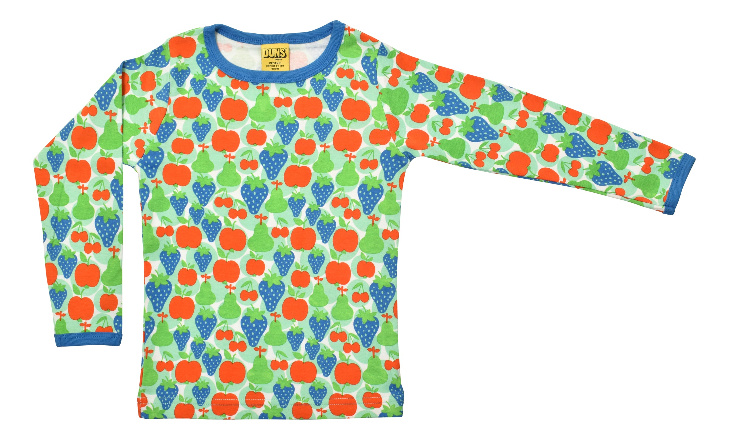 Yummy fruit in gorgeous colours, taping in French Blue/Kikorangi at cuffs and neckline.